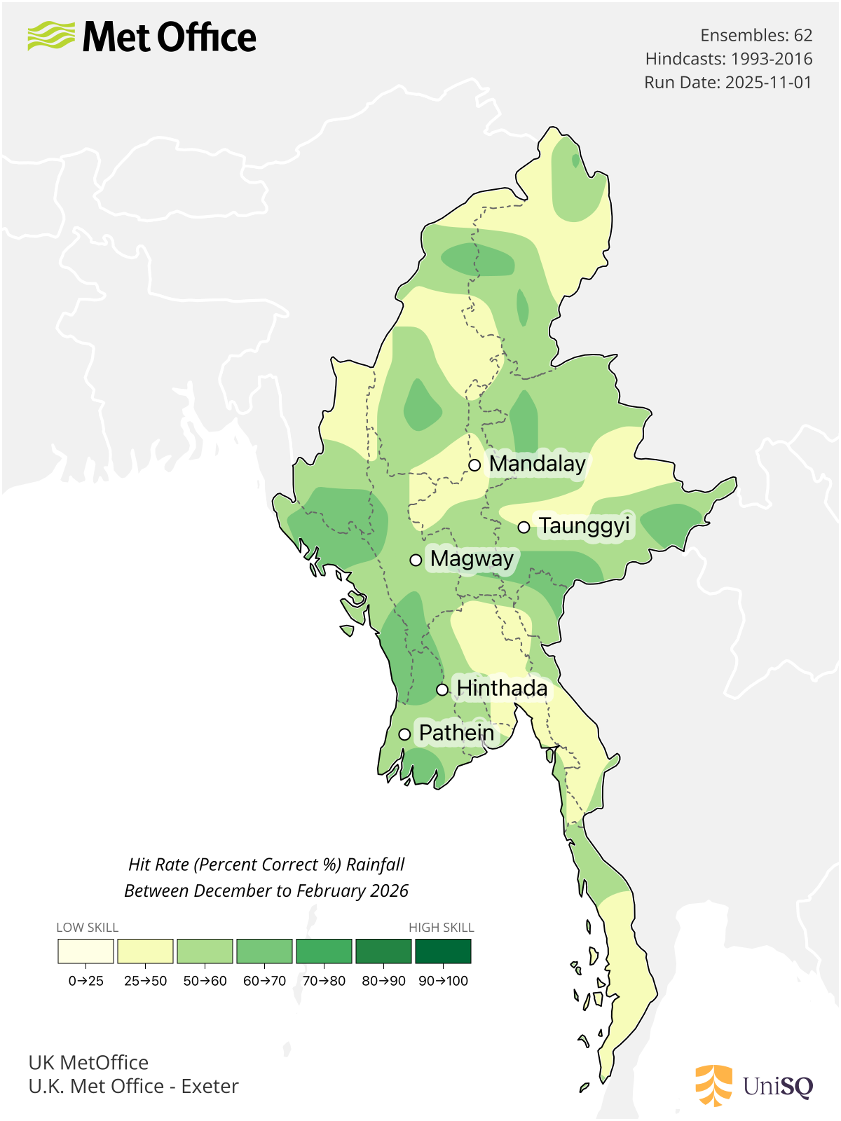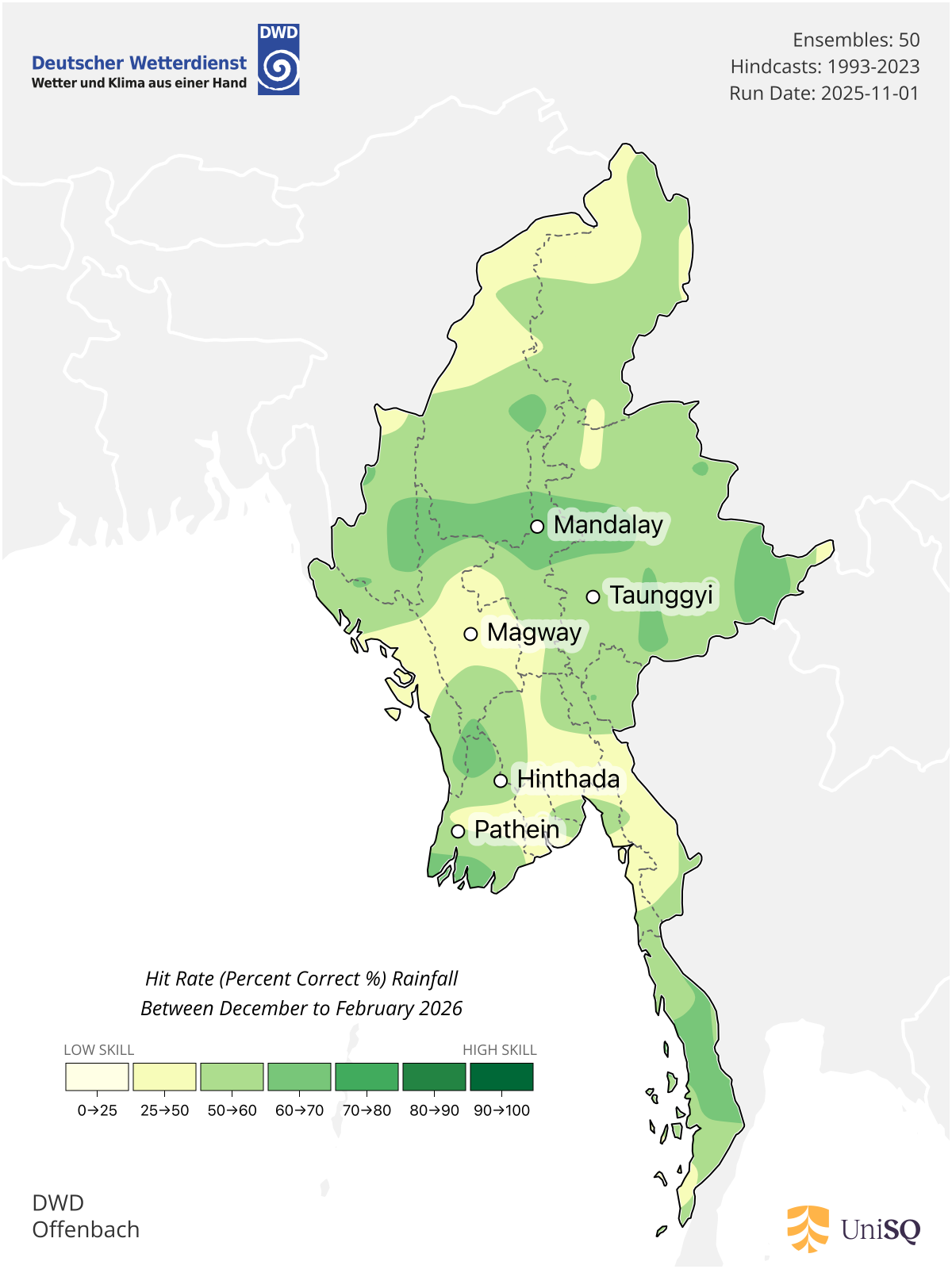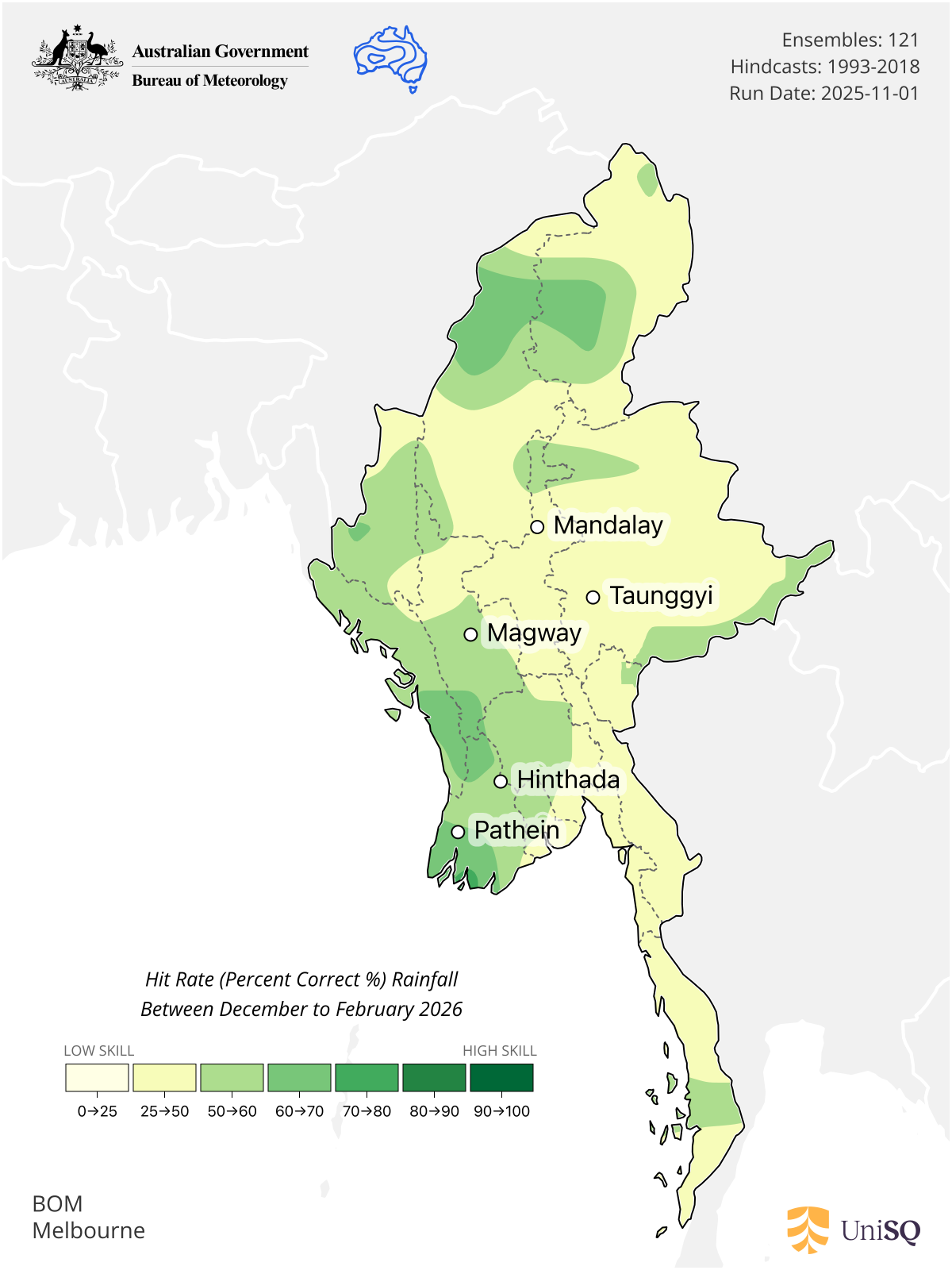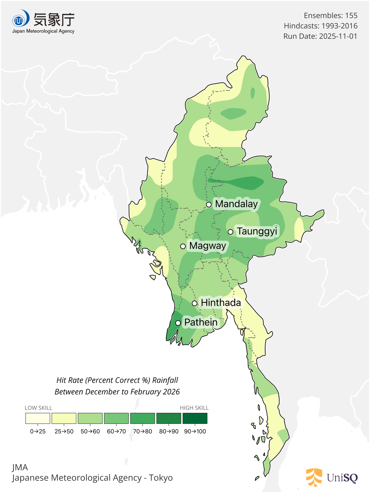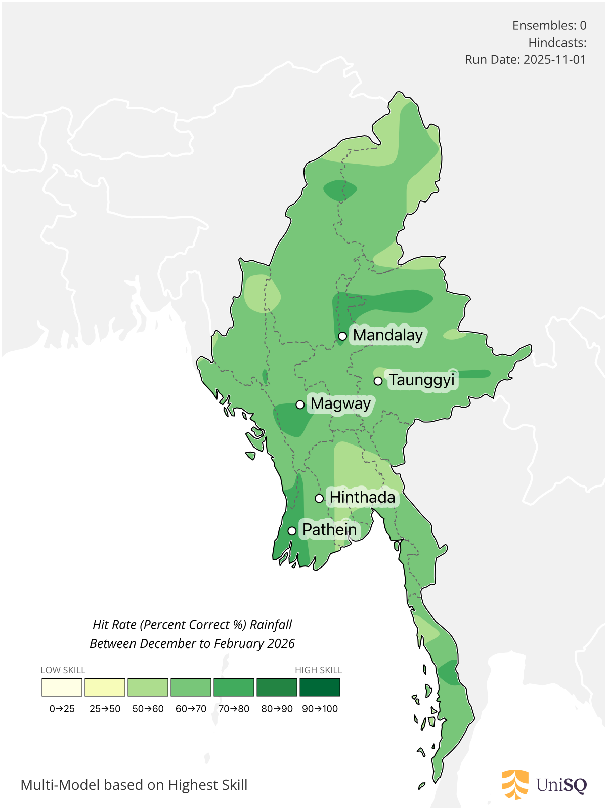 For each model the skill is calculated by comparing the modelled hindcasts with the observed values for the same region and season using Gridded Climate Data. For the current set of models the Skill is calculated using the hindcast values from 1993-2016.