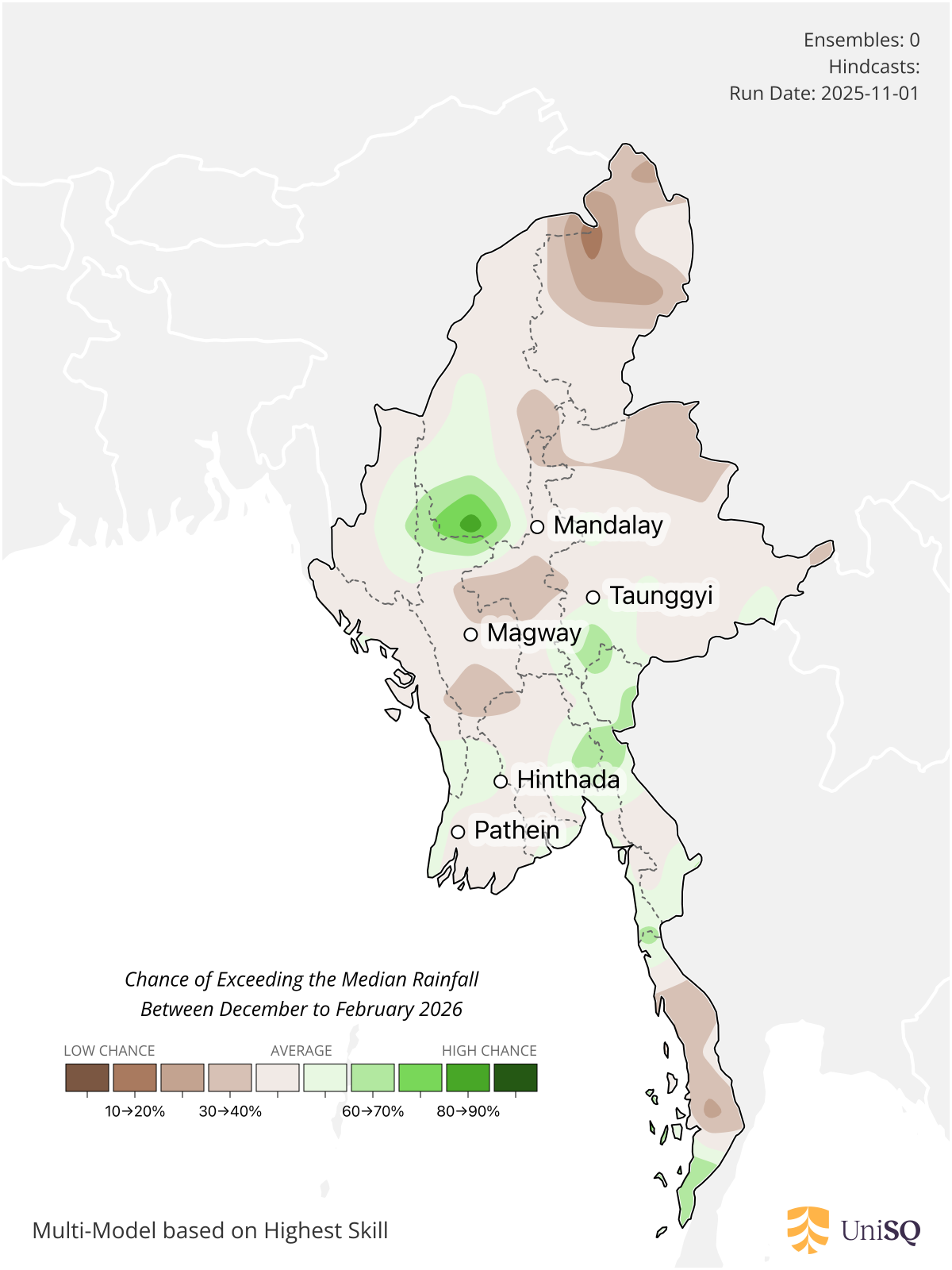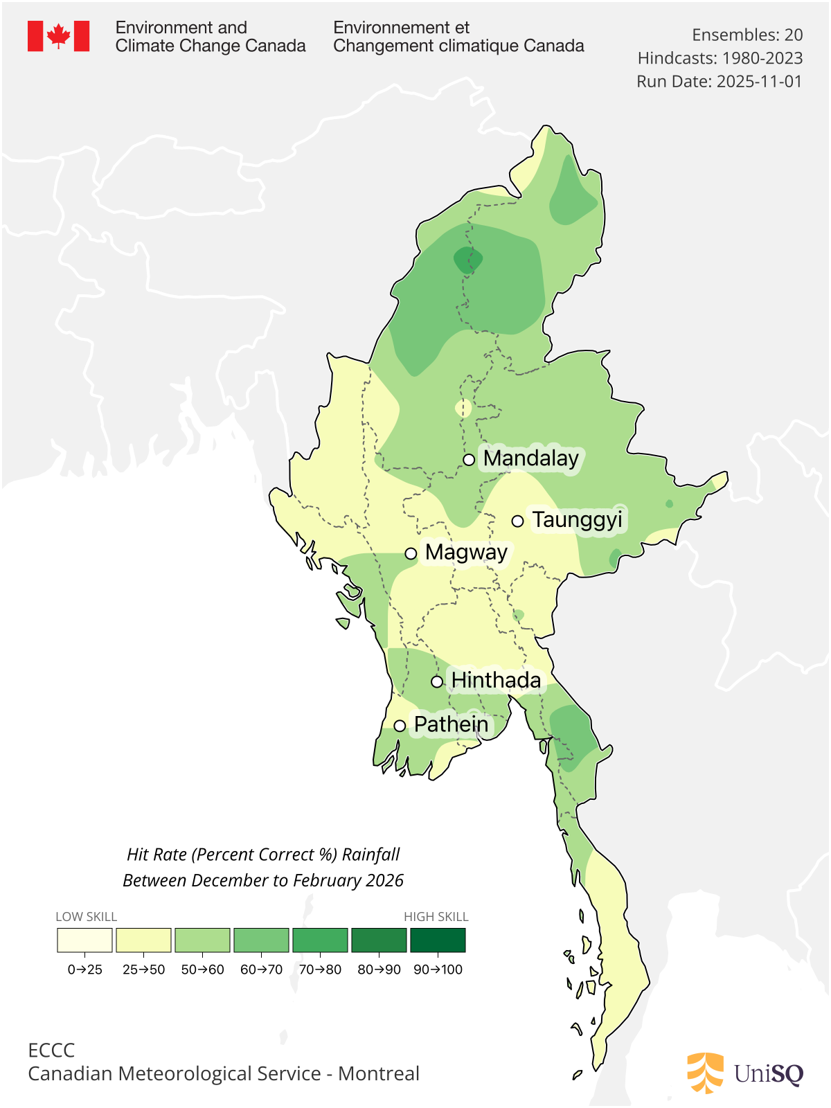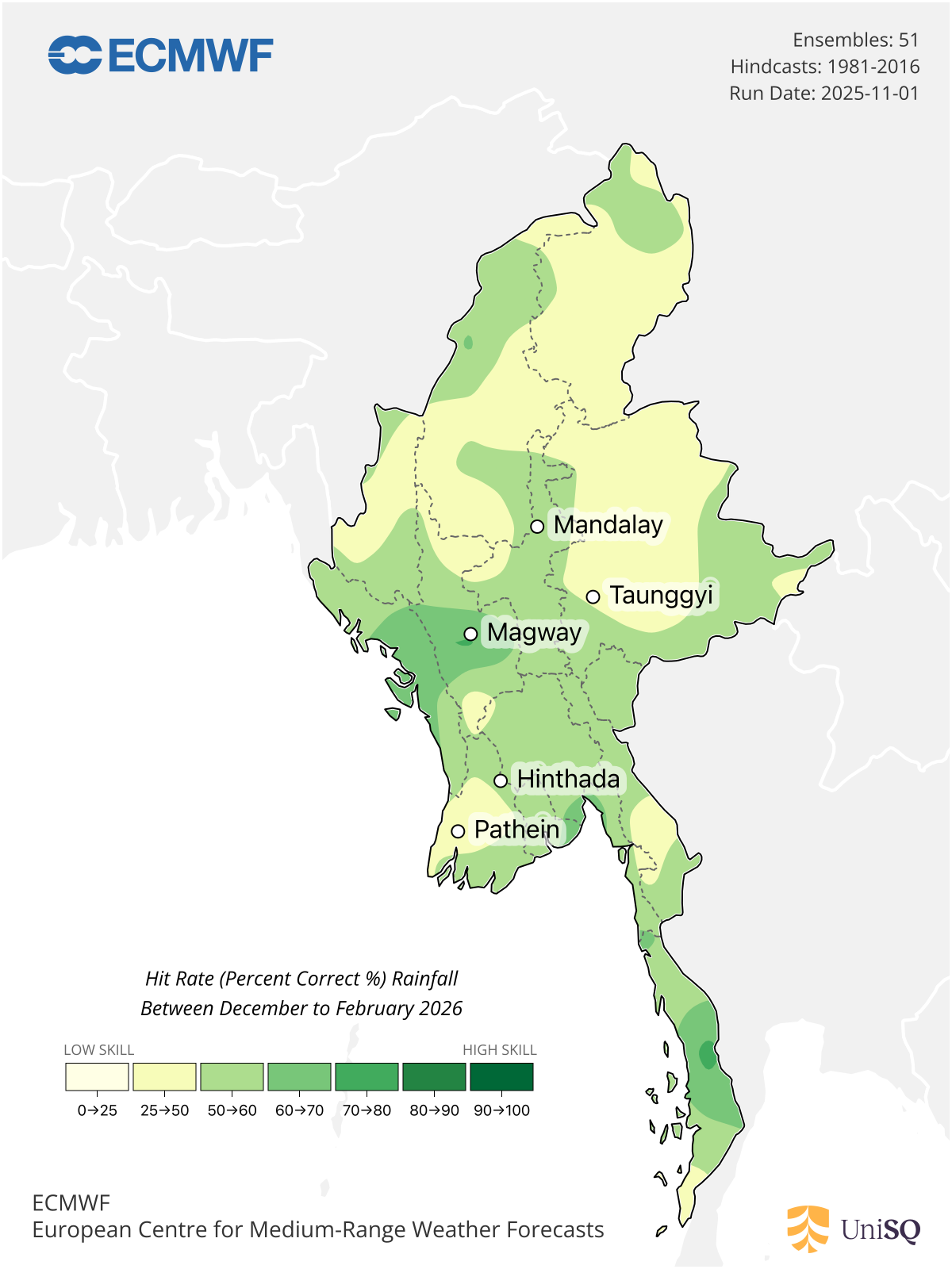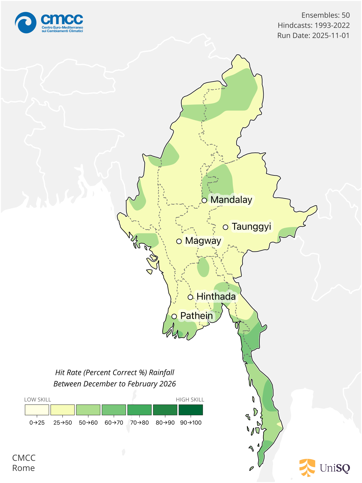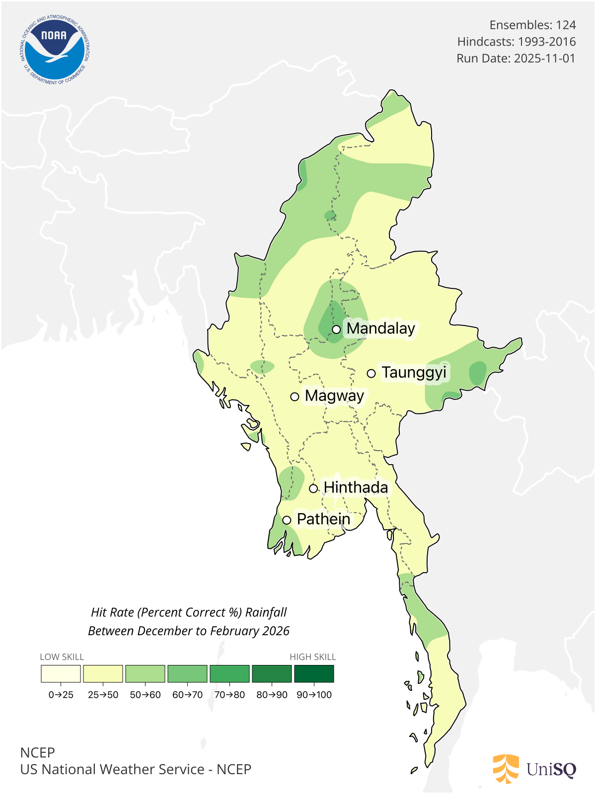 For each model the skill is calculated by comparing the modelled hindcasts with the observed values for the same region and season using Gridded Climate Data. For the current set of models the Skill is calculated using the hindcast values from 1993-2016.